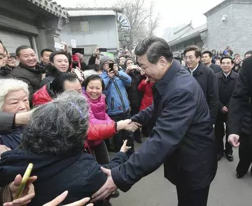 图为:2014年2月25日习近平在北京市考察。这是习近平在东城区考察玉河历史文化风貌保护项目时与群众热情握手。